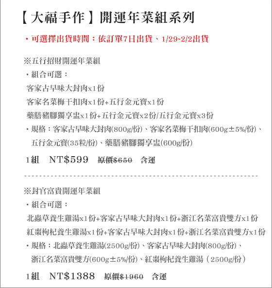 ![]() 台塑生醫-舒暢益生菌 售價:599 我要購買 台塑生醫-舒暢益生菌-為身體做環保!九種複合益生菌、三種順暢營養素、三包埋防護技術,三效合一,通暢每日好心情!平均每盒最低只要599元起(含運)即可購得【台塑生醫】舒暢益生菌1盒/2盒(4gx30包/ | ![]() 瑪琪朵義式廚房-雙人經典主廚推薦套餐 售價:299 我要購買 瑪琪朵義式廚房-雙人經典主廚推薦套餐-大展專業義麵的多層次風味!超人氣經典美食,豐富多元的義式創意,伴隨美樂演奏,以十足份量擄獲味蕾只要299元(雙人價)即可享有【瑪琪朵義式廚房】原價572元雙人經典 | ![]() 京兆尹.養生御膳-雙龍飛騰套膳/四季平安套膳 傳承中國正宗御膳手藝,重現帝王養生用膳飲食文化,品嚐名菜食材特製的宮廷風味饗宴! 售價:1480 我要購買 京兆尹.養生御膳-雙龍飛騰套膳/四季平安套膳-傳承中國正宗御膳手藝,重現帝王養生用膳飲食文化,品嚐名菜食材特製的宮廷風味饗宴!京兆尹.養生御膳 雙龍飛騰套膳/四季平安套膳 |