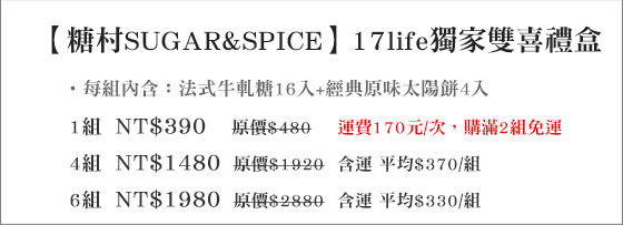 ![]() 買新鮮-純手工宜蘭拔絲蔥抓餅 售價:49 我要購買 買新鮮-純手工宜蘭拔絲蔥抓餅-超人氣團購商品,網路回購率NO.1!精選宜蘭三星蔥獨家比例調配!餅皮金黃酥脆、層層薄脆口感越嚼越香!宅配:平均每包最低只要49元起即可帶走【買新鮮】純手工宜蘭拔絲蔥抓餅1 | ![]() 京兆尹.養生御膳-雙龍飛騰套膳/四季平安套膳 傳承中國正宗御膳手藝,重現帝王養生用膳飲食文化,品嚐名菜食材特製的宮廷風味饗宴! 售價:1480 我要購買 京兆尹.養生御膳-雙龍飛騰套膳/四季平安套膳-傳承中國正宗御膳手藝,重現帝王養生用膳飲食文化,品嚐名菜食材特製的宮廷風味饗宴!京兆尹.養生御膳 雙龍飛騰套膳/四季平安套膳 | ![]() 漢諾威馬術俱樂部-馬術課程系列 縱馬馳騁,結合力與美的優雅運動!正規英式馬術教學,國際級標準場地,一對一專業指導! 售價:2500 我要購買 漢諾威馬術俱樂部-馬術課程系列-縱馬馳騁,結合力與美的優雅運動!正規英式馬術教學,國際級標準場地,一對一專業指導!漢諾威馬術俱樂部 馬術課程系列 |